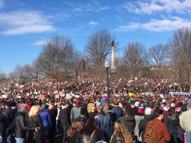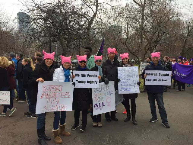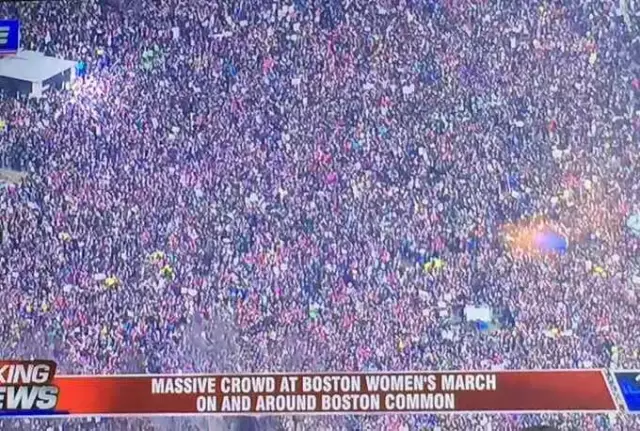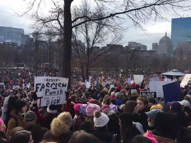 “今天波士顿注册游行人数9万,据一位警察讲,实际到了大约20万,地铁免费(但几乎挤不上,我们三次没挤上,步行半个多小时到,有人五次还没挤上)先集会,演讲,再游行,游行沿途不断有音乐、歌唱,最后有人即兴舞蹈,很多人加入,虽然是抗议,自发组织,但充满理性、秩序、激情、欢乐、友爱、温暖和希望。游行队伍散去,没有一点垃圾,仿佛没有这么多人曾经到此集会游行一样。游行快结束时大家在街头即兴边歌边舞。”--YF