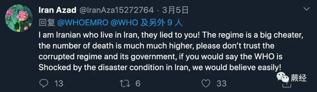 其实不仅对于中国的网页展示,WHO在某些其他地方也开始被强烈质疑。这两天WHO一个帖子说去伊朗进行新冠肺炎视察之后对当地的高品质医护、传染控制与手段之高效、医护人员的尽职尽责、公卫意识提升的动员能力等等留下了深刻的印象。但这段四平八稳政治正确到极点的官方言论被评论前赴后继地批评或讥讽,这情有可原因为这实在和伊朗在疫情中展现出来的种种数据和客观细节不符合,应该说太不符合了。