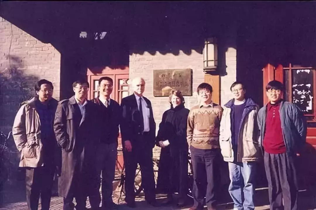 1994年中國經濟研究中心成立初期合影(左起:張帆、易綱、林毅夫、德懷特•帕金斯、帕金斯夫人、海聞、餘明德、張維迎)