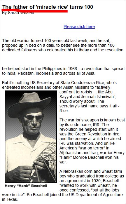 要知道,世界上公认的水稻之父是一个美国人 名字叫做Henry M. Beachell(1906-2006)