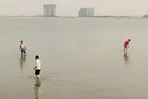 几个当地人在渤海的水里试图抓到一些虾或鱼。背景是曹妃甸的烂尾楼。