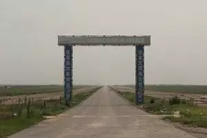一个废弃的公路施工工地的大门。这里甚至还有一座“烂尾桥”──在树立起10座桥塔后,那座六车道的大桥就被废弃了(图中未现示)。 Gilles Sabrie for The Wall Street Journal