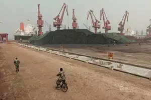 保安在河北省曹妃甸工业区港口附近工作。曹妃甸工业区的现状折射出中国经济的步履蹒跚,以及中国要想挽救曾经备受称赞的经济模式有多难。