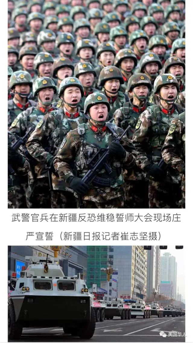同一天中国也在新疆多地举行了“利剑出鞘雷霆万钧 — 新疆反恐维稳誓师大会”。