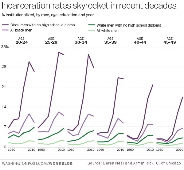 上面这张图显示的是美国白人、黑人,高中学历以下和以上者,从1960年到2010年,在20岁到49岁间,按照间隔5岁一组所显示犯罪收监率。可见,种族隔离被废除后,所有的年龄组犯罪率都增加了,黑人无高中学历者(紫线)增幅最大,可谓扶摇直上,其次是黑人有高中学历者(淡紫线)增幅也很大。