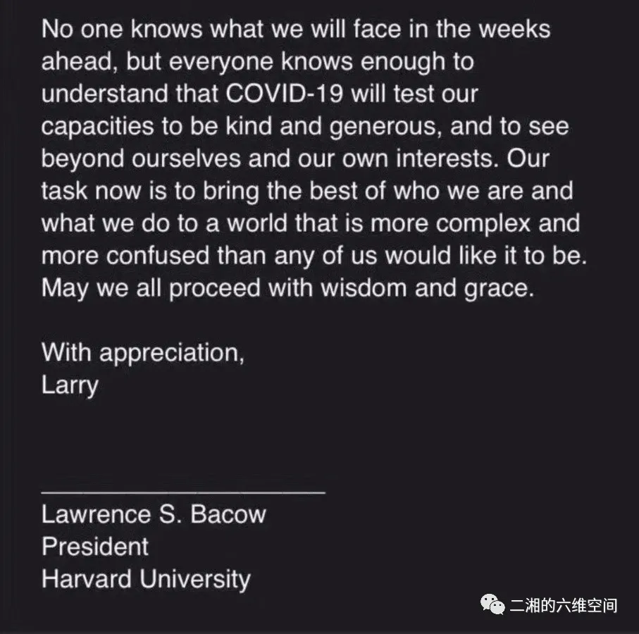 这里我附上哈佛大学校长在通知学生离校的电邮里说的一段话以及我的翻译。