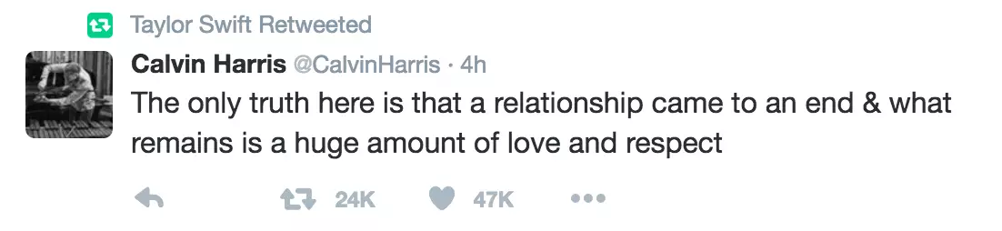 今天Calvin Harris在Twitter证实两人已经和平分手,霉霉也转发了这条消息。