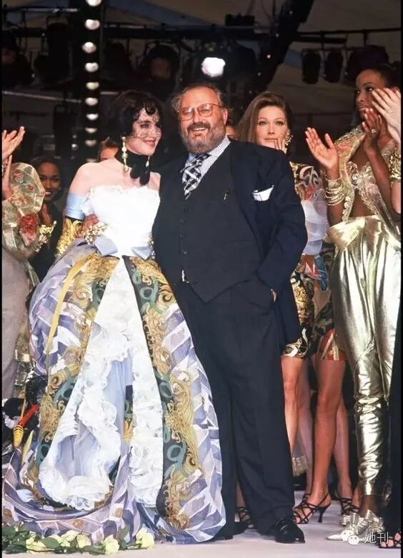 和Dior设计师Gianfranco Ferre (后面是Carla Bruni、Nomi Campell等世界超级名模)