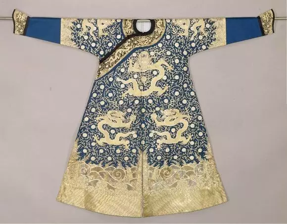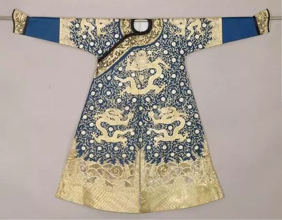 清中期藍色江綢平金銀纏枝菊金龍紋袷袍,此為清代皇帝吉服。