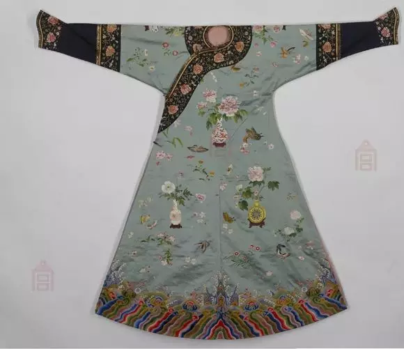 光清乾隆淺綠色緞繡博古花卉紋袷袍一件禮袍,就運用了套針、斜纏針、接針、桂花針、扎針、滾針、打籽針、施針、圈金繡等多種針法。