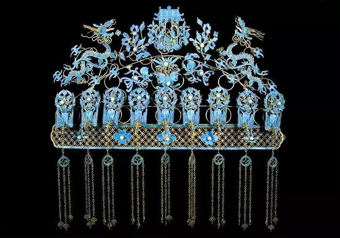 表層全部點翠,鳳冠前部綴5隻金累絲鳳,上嵌珍珠、寶石,口銜珍珠、寶石流蘇。金鳳下排綴9隻金翟,為銀鍍金質,口銜珍珠、珊瑚、綠松石、青金石、紅藍寶石等貫串的流蘇。