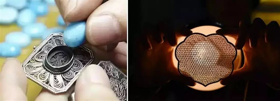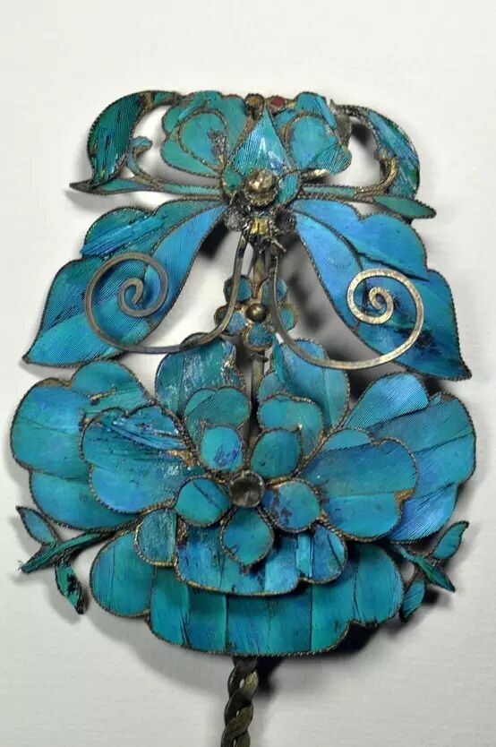 於是就用金、銀、銅或鎏金的金屬做成不同工藝圖案的底座,再把翠鳥背部亮麗的藍色羽毛剪切後仔細地鑲嵌在座上,製成點翠。點翠看似容易,工藝卻極其複雜。