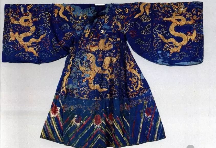 袍式為立領、右衽,系藍色緞地,除蟒紋外,還繡金彩雲龍和立水紋。