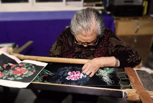 以緙絲為底的手工雙面繡,花卉層次立現,又豈輸歐洲高級工坊。