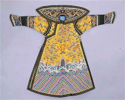 明黃緙絲彩雲金龍紋女綿朝袍·前式,為清嘉慶皇后冬季所穿。