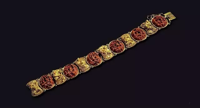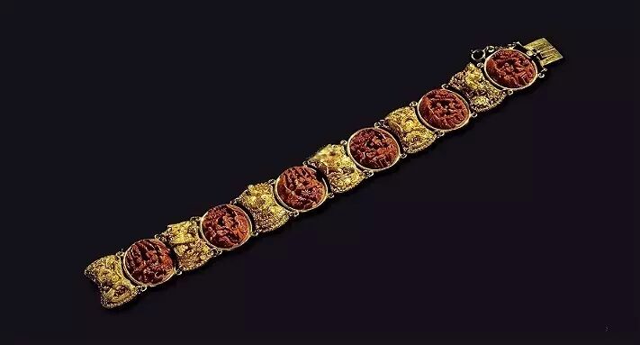 民國 金質累絲鳳紋嵌核雕“珠江市井”卡扣手鍊(估價:RMB 20,000-40,000)