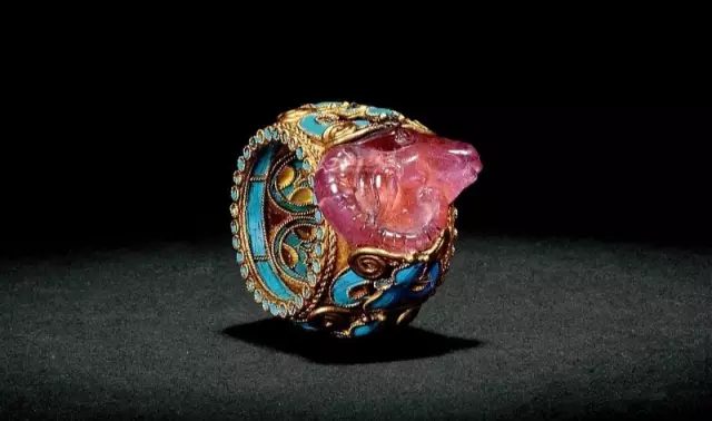 戒面為一粉紅碧璽質地的大綿羊首,羊角下卷,羊耳微垂,圓目大睜,口鼻微張,羊首兩側以點翠蝙蝠相簇,指圈內側仍有點翠連錢紋裝飾,足以可見清朝王室real會玩。