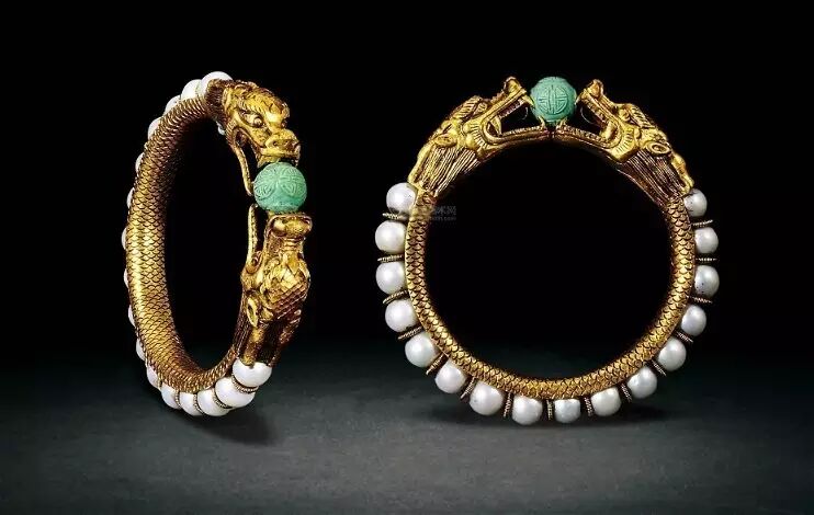 清 金質嵌珍珠、松石“雙龍戲珠”手鐲(估價:RMB 100,000-200,000)