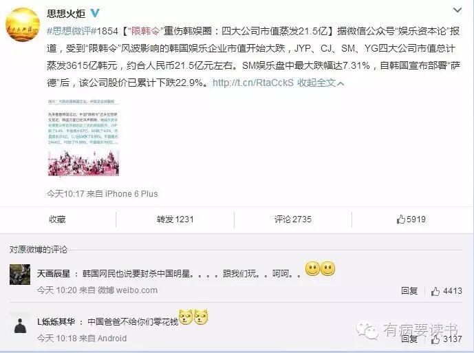 虽然这次的限韩令广电总局没有证实也没有否认,威力已然不小了:这则“传言”,已经让韩国四大娱乐公司CJ、SM、JYP、YG总市值下降了3615亿韩元(21.5亿人民币)。