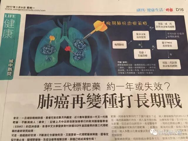 “ … 早期肺癌的徵状不明显,不少病人确诊时,已属第四期,... 第一,二期尚可籍着外科手术处理,但进展至第四期, 肿瘤已转移及扩散, 传统上会用化疗控制。但十多年前发展了标靶药物,... 确诊肺癌后会抽验肿瘤基因, 若发现是基因变异, 首选用标靶药物,治疗效果比化疗佳。... 使用第一代标靶药, … 服用约九个月至一年左右,会出现抗药性,令第一二代标靶药均无效, 病情转差,可能需要接受化疗。... 虽然第三代标靶药物已出现,但肺癌细胞越战越勇, 第三代标靶药平均控制时间约11个月, 病人开始产生抗药性,再出现新的基因变异。