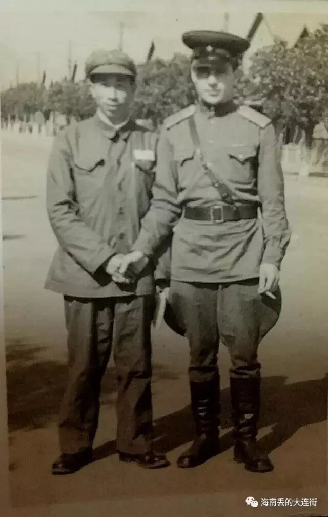 1954年夏,朱有余所在部队从朝鲜归国后驻防大连,与驻连苏军军官于高尔基路留影~朱爱华友情提供