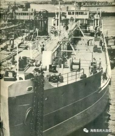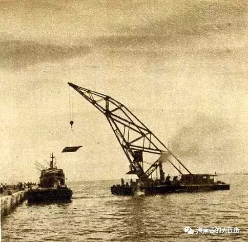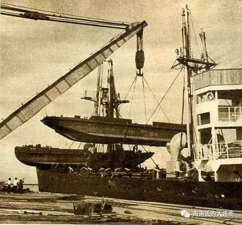 1952——为了发展城乡物资交流,内河航运需要大量的小轮,起重机正将小货轮装到万吨大货轮上。