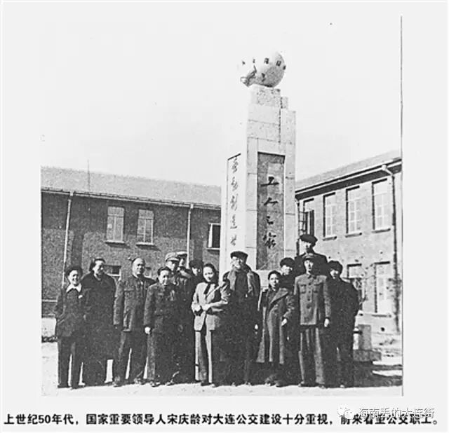 宋庆龄在旅大行政公署(后改旅大市人民政府)门前参观拖拉机 并合影留念
