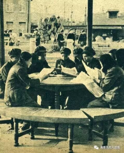 1951大连交通公司工人宿舍—“工人之家”是设备齐全的宿舍, 休息时间工友们在庭院里讲报