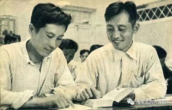 全国劳动模范宋世发(右)在大连工业俄文专科学校学习俄文, 准备到苏联去深造。