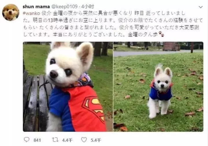 它永远地离开了这个世界 它的主人说 “俊介星期五晚上突然生病了 在昨天离开了这个世界 谢谢大家的爱” ▼