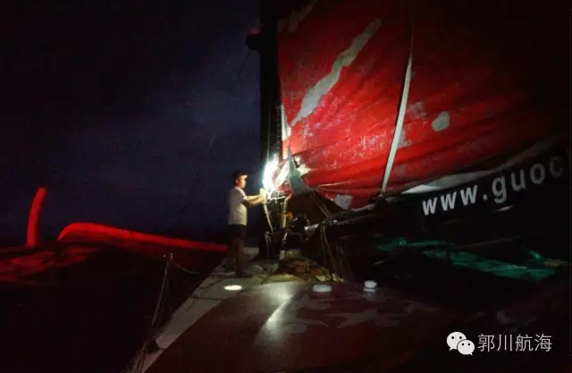 2012年12月环球航行中,帆船遭遇大前帆破损,船帆坠入水中,郭川紧急停船,在漆黑的夜里花费了一个小时将帆捞起;