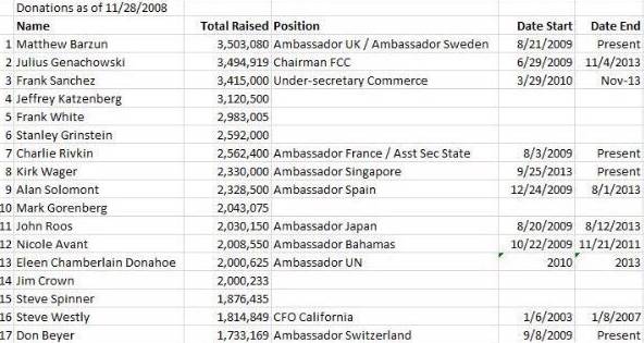 做美国驻外大使通常不会出问题,根据美国外交官协会(American Foreign Service Association)的数据,在过去的60年中,大概有72%的外交官都是由总统任命,只有14%左右的大使是职业外交官,其余缺乏或完全没有外交经验。克林顿时期28%的外交官是自己的支持者,小布什时期则是30%,奥巴马时期37%[7],其中不乏加拿大、澳大利亚、法国等世界主要国家的外交官,现任驻华大使就承认自己并没有中国经验。2001年-2009年在任的前美国驻华大使雷德(Clark T. Randt, Jr.)则是小布什在耶鲁骷髅会的朋友。小布什的驻加拿大大使给他筹资20万美元,捐款总额超过33,000美元。驻瑞典大使也是榜上有名的金主[8]。为区分金主的贡献度,小布什团队专门将其分级,有ranger和pioneer等级别[9]。希拉里和川普的竞选团队也做过类似的事。