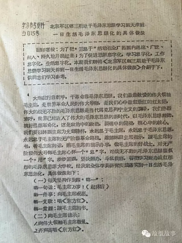 一日生活毛泽东思想化 经我班全体学员研究实践落实到一日生活毛泽东思想化,具体做法如下: (一)每天坚持做到四“第一” 第一句话:毛主席万岁!(起床后) 第一件事:向毛主席祝愿。 第一支歌:唱《东方红》。 第一堂课:读毛主席的书。 (二)向毛主席请示: 1、向伟大领袖毛主席敬礼。 2、齐声高唱《东方红》。 3、共同敬祝我们心中最红最红的红太阳、最最敬爱的伟大领袖毛主席万寿无疆!万寿无疆!万寿无疆! 敬祝我们的林副统帅身体健康!永远健康!永远健康! 4、向伟大领袖毛主席宣誓:(誓词:我们要一辈子读您的书,听您的话,照您的指示办事。誓死保卫您,誓死保卫您的伟大思想,誓死保卫您的无产阶级革命路线。誓做一个忠于党,忠于您老人家,忠于人民的红色战士。) 5、学习最高指示。 (三)天天读:每天八——九点天天读,主要读老五篇,以个人阅读为主,带着问题学,活学活用,学用结合,急用先学,立竿见影,在用字上狠下功夫。 (四)三前(上班、开会、吃饭)做到三不忘:即不忘向毛主席祝愿,不忘学习最高指示,不忘唱《东方红》或者其他革命歌曲(天大地大不如党的恩情大、大海航行靠舵手等等)。 (五)时时、处处、事事用毛泽东思想挂帅,做到四个不离:即手不离毛主席的书,口不离毛主席的话,心不离毛主席的指示,行动不离毛主席的教导。 1、小组学习讨论时,个人要选用有针对性语录来指导自己的思想,用毛主席的话来说明问题,活学活用。 2、同志互相谈心,互相帮助,互赠语录。 3、打电话第一句话要说:祝毛主席万寿无疆或读最高指示。 (六)集体队列生活革命化: 口令: 集合:召之即来! 立正:毛主席万岁!万岁!万岁!万岁!万岁! 向右看齐:打到刘、邓、陶! 向前看:胸怀祖国,放眼世界。 向右转:“要斗私批修”。 向左看:向林副主席学习。 起步走:紧跟毛主席,永远干革命。 稍息:提高警惕。 解散:加强纪律性,革命无不胜。 行进间:口号: 1、伟大的导师、伟大的领袖、伟大的统帅、伟大的舵手毛主席万万岁!万岁!万岁!万岁! 2、下定决心,不怕牺牲,排除万难,去争取胜利。(可重复) 3、团结、紧张、严肃、活泼。 (七)向毛主席汇报(下班前) 1、向毛主席敬礼。 2、向毛主席和林副主席祝愿。 3、学习最高指示。 4、个人汇报(一天的思想革命化的经验、教训、体会)。 5、唱《大海航行靠舵手》。 杭州发电设备厂革命造反联合总司令部政宣组翻印 1968年5月19日