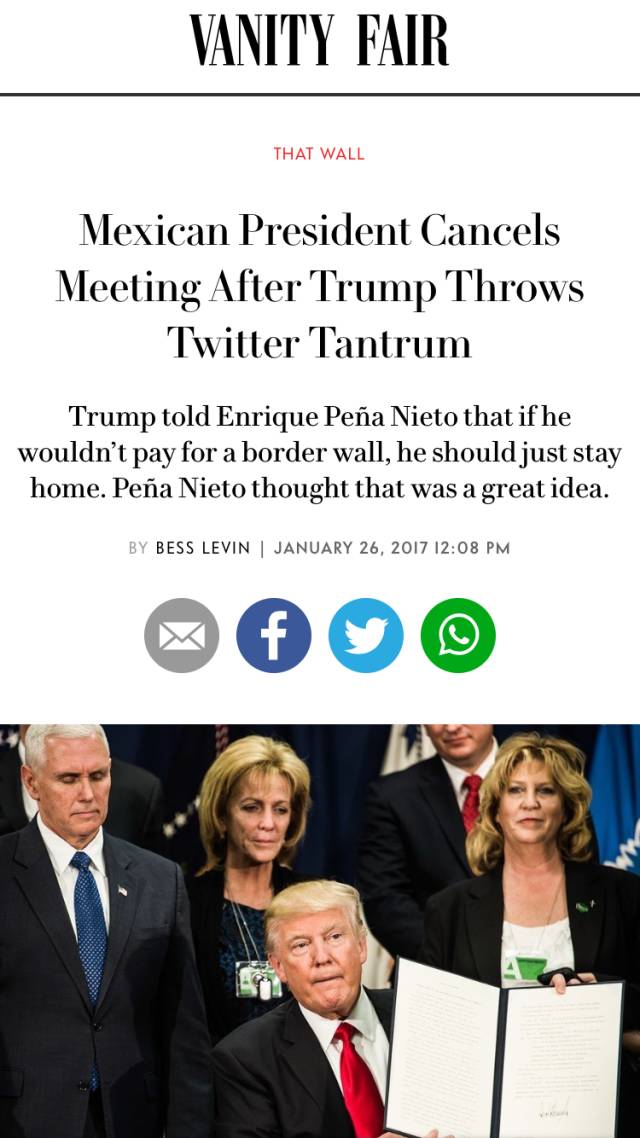 墨西哥总统Enrique Peña Nieto随后宣布取消原定于下周二的访美计划,并表示将尽全力保护墨西哥在美移民的安全。