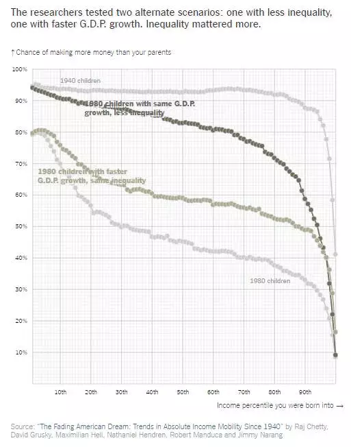 但是1940年后出生的情形就不同了,特别是低收入群开始有越来越多的人收入不如父辈高,到1980年出生的,连接近底层30%收入家庭的人也比不过父辈了,这就相当令人担忧了。专家分析认为造成1970年出生的人情况不如以往的原因是90年代能源危机致使美国经济发展减慢。而90年代之后的每况愈下则归咎于经济的全球化、新型技术的诞生、政府对富人税收的放宽,工会组织被削弱,以及教育投资,包括技工技能培训的削减。综合来看,经济发展的减慢和贫富差距的拉大是最主要的两个因素。学者们又做了模拟,把1980出生的与1940出生的比较,以1940的为基准,一个模拟状态是让1980的经济增长与1940相同,另一个是贫富差距相同,看这两者哪个的作用更大。由下图可见,贫富差距的作用大得多,也就是说,贫富差距的增大是造成子辈收入不如父辈的最重要因素。
