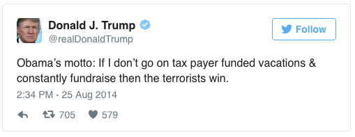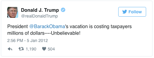 看下图,川大帝的推特,对奥巴马的差旅度假开销多么义正严辞啊!