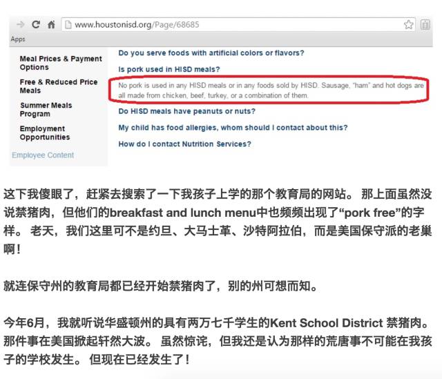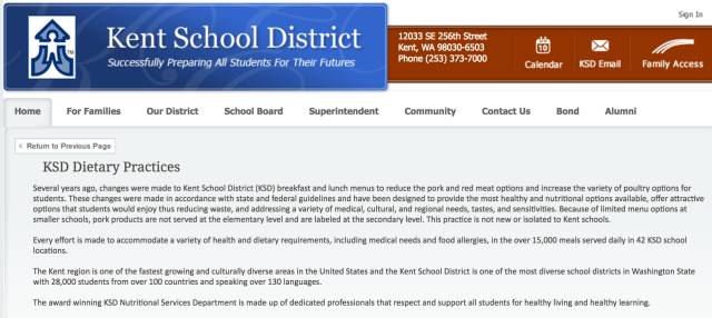 还有,你关于 Kent school district 的解释本身就是个半谎言。 你给的原因: 我们在午餐中取消猪肉是为了减少红肉,增加鸡肉的选择给学生。 这些改变是因为联邦和州立政府对健康饮食的倡议。 Kent学区的小学由于菜单上选择不多,所以没有包括猪肉,但在中学的菜单上有猪肉。 我们已经这样做很多年了。 但这是它的原文: Several years ago, changes were made to Kent School District (KSD) breakfast and lunch menus to reduce the pork and red meat options and increase the variety of poultry options for students. These changes were made in accordance with state and federal guidelines and have been designed to provide the most healthy and nutritional options available, offer attractive options that students would enjoy thus reducing waste, and addressing a variety of medical, cultural, and regional needs, tastes, and sensitivities. Because of limited menu options at smaller schools, pork products are not served at the elementary level and are labeled at the secondary level. This practice is not new or isolated to Kent schools. Every effort is made to accommodate a variety of health and dietary requirements, including medical needs and food allergies, in the over 15,000 meals served daily in 42 KSD school locations. The Kent region is one of the fastest growing and culturally diverse areas in the United States and the Kent School District is one of the most diverse school districts in Washington State with 28,000 students from over 100 countries and speaking over 130 languages. The award winning KSD Nutritional Services Department is made up of dedicated professionals that respect and support all students for healthy living and healthy learning. 你漏掉了很重要的原因吧? |