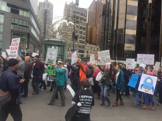 數萬名民眾集結在中央公園西側近哥倫布圓環(Columbus Circle),有的身著白色科學家長褂,有的以綠色服裝象徵環保,舉著標語寫著「科學事關重大」、「讓美國更加健康」、「停止削減科研經費」、「要科學不要沉默」等,反對川普對環境問題漠視和反科學的態度,呼籲其正確對待環境、停止削減醫療科研等重要領域的經費,為美國的長久持續發展打下堅實基礎。