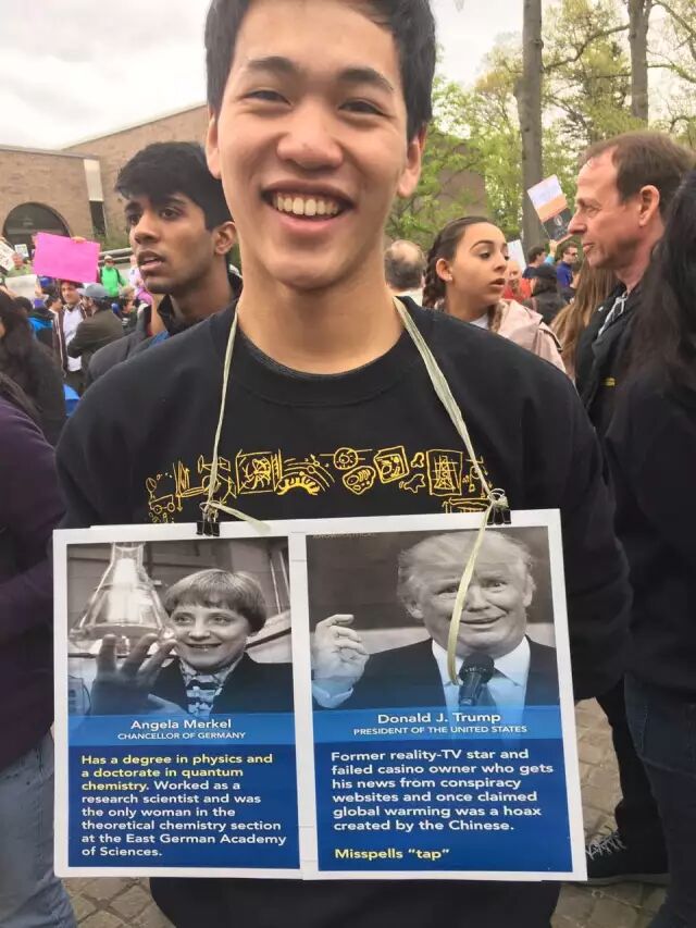 4月22日,从华盛顿到旧金山,从纽约到洛杉矶,从南极到北极,美国和世界各地超过600个城市爆发了“科学大游行”(March of Science),这样超大规模的科学家参与和支持科学的示威游行活动是史无前例的。从各种标语可以看到人们反对川普政府削减科研经费,反对川普的种种反智、反科学的言论和政策。关于本次大游行的背景,请参见昨天“美国华人”公众号推出的北大飞的文章《保卫科学,守护文明 —— 地球日“全美科学大游行”》。