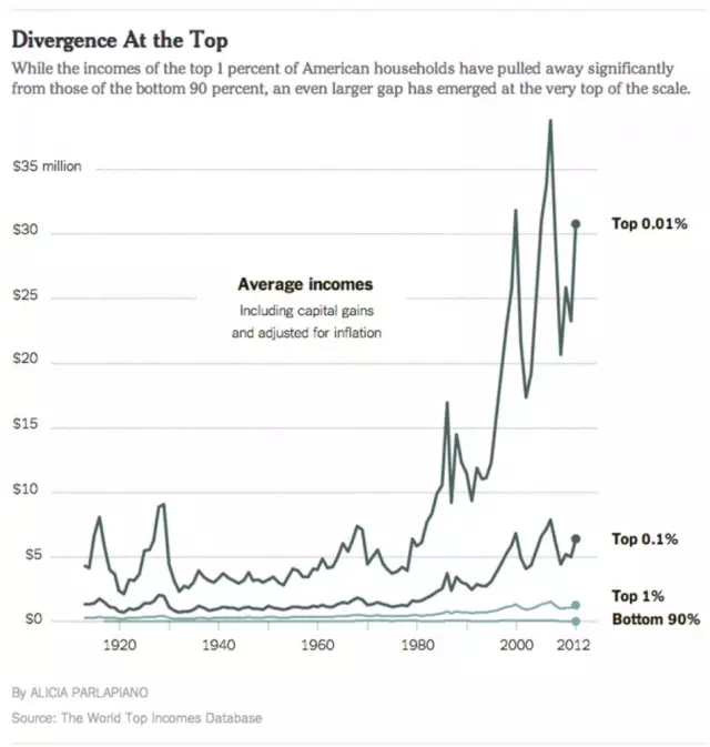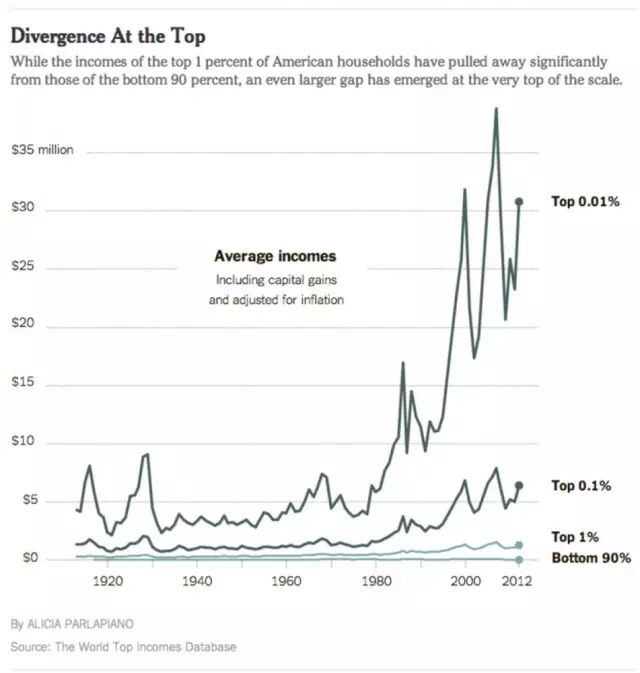 我来列几个图表,从收入情况来看看美国人的钱都跑哪里去了,同时也可以看到美国的贫富悬殊从什么时候开始的。从这里希望大家能看到,谁是共和党的减税政策的大赢家,也看一看你自己是和谁的利益更近一些。