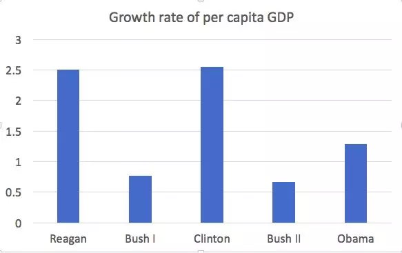 GDP在里根、老布什、克林顿、小布什和奥巴马总统期间的增长图