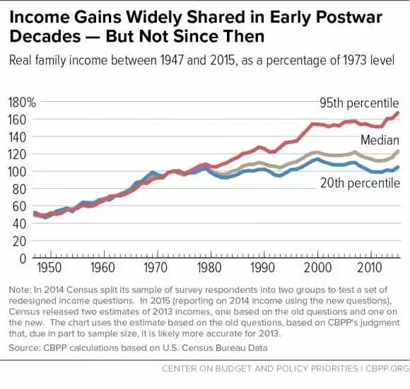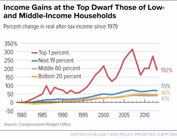 大家慢慢地接受了这种“理论”,从里根开始,共和党一旦有机会,就是减税。这不光是联邦级,州级政府也是一样。其结果就是收入悬殊越来越厉害,收入慢慢都到了最富人的手里,中产阶级的收入增加缓慢。 然后就是哭穷,不断地吓唬人民说吃福利的人太多,养懒人,再不减少福利,国家就要破产了。直到今天,川普还是利用中产阶级的衰退带给人民的不满,把责任推到移民和有色人种的身上,终于当选了总统。很有讽刺意义的是: 大家把改变美国的希望寄托在了一个造成这种中产阶级衰落的理论和一个卖假药的富翁身上,真是被人骗了还给人数钱啊!