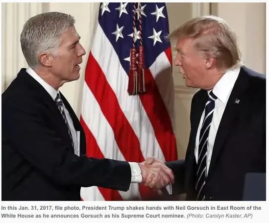 川普提名保守派法官Neil Gorsuch为大法官。Gorsuch履历完美,学识、人品、口碑各方面都良好,在参议院听证会上回答问题也是滴水不漏。虽然批评他的人士认为他过去的判案一直倾向于大企业大财团,但总体上是一位合格的人选。由于民主党声称要用费力把事拖(filibuster)的方式阻止提名确认,共和党最终采用“核武器”(nuclear option)的方式强行通过了Gorsuch大法官的提名确认。
