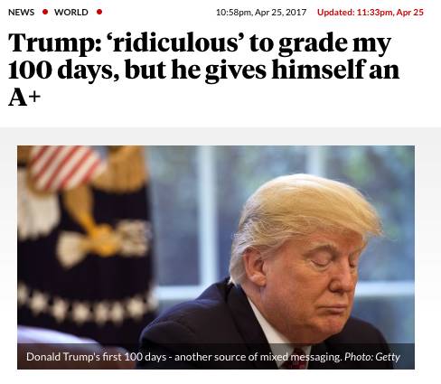 今天,2017年4月29日是川普总统就任第100天,在此激动人心的时刻,让我们对照川普和美国选民之间的神圣合同中几个核心条款和他老人家这100天来辛勤工作的成果,做一份他的成绩单。