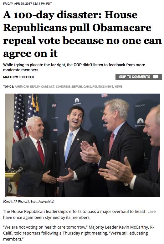 在共和党控制白宫、共和党控制的参议院、众议院的情况下,撤销和替换奥巴马医保的法案,即所谓的“Ryan医保法案”,由于得不到足够的票数,共和党自己撤回了法案。详见:《北大飞:共和党突然撤回其医保法案》