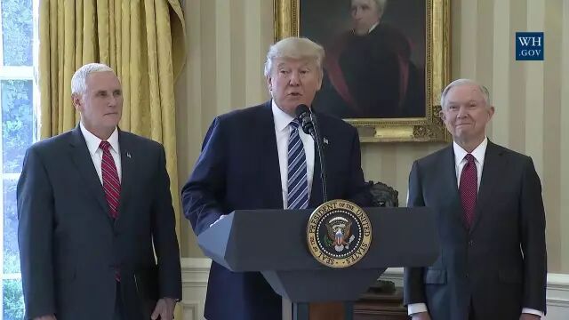 川普总统和彭斯副总统、塞申斯司法部长在白宫。