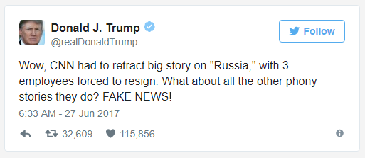 特朗普总统怎能放过这个狠狠打击CNN的机会呢?他一早也发推说,“CNN不得不撤回事关‘俄罗斯’的新闻、三个记者被迫辞职,那么其它的假报道呢?假新闻!”