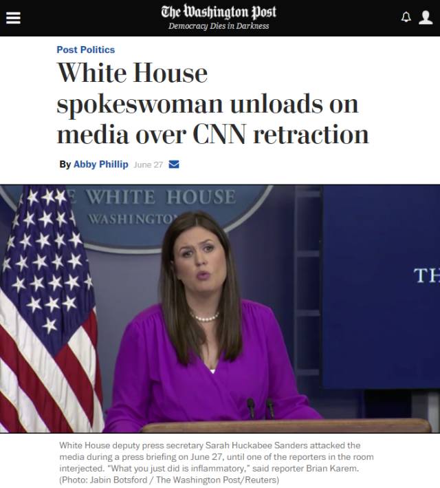 星期三的新闻发布会,白宫副发言人桑德斯上来就跟极右媒体Breitbart一唱一和,演出了一场抨击严肃媒体的双簧,直指CNN日前撤回一篇有关"通俄门"的报道并解雇报道程序违规的三名记者还远远不够,怒怼CNN就是“假新闻”。