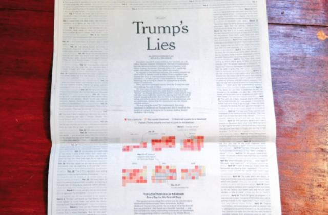 《纽约时报》把特朗普上任以来的几百则谎言密密麻麻地印了一个整版,并附上相应的事实真相,但至今为止我们没见到特朗普为自己的谎言道歉过一次。