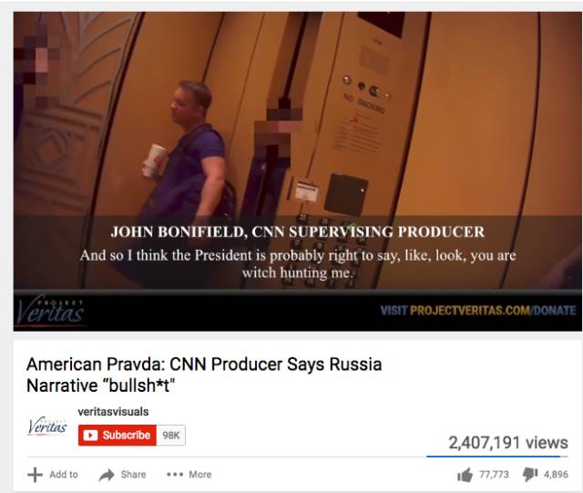 桑德斯并推荐一个来自右翼组织Project Veritas的有犯罪前科的James O’Keefe公布的偷拍视频,该视频捕捉了和位于亚特兰大的CNN健康频道制作人John Bonifield的对话,这位本来和政论节目完全不沾边的制作人说了一些很让白宫满意的话: